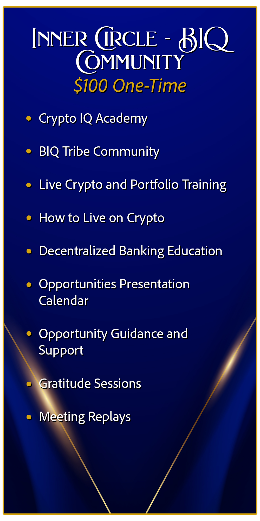 We’ve built a vibrant, supportive space where you can grow at your own pace from watching curated YouTube lessons in our Crypto IQ Academy, to joining deep-dive live trainings and masterminds in the Inner Circle, to leveling up in business and global trade as an IQ Partner.